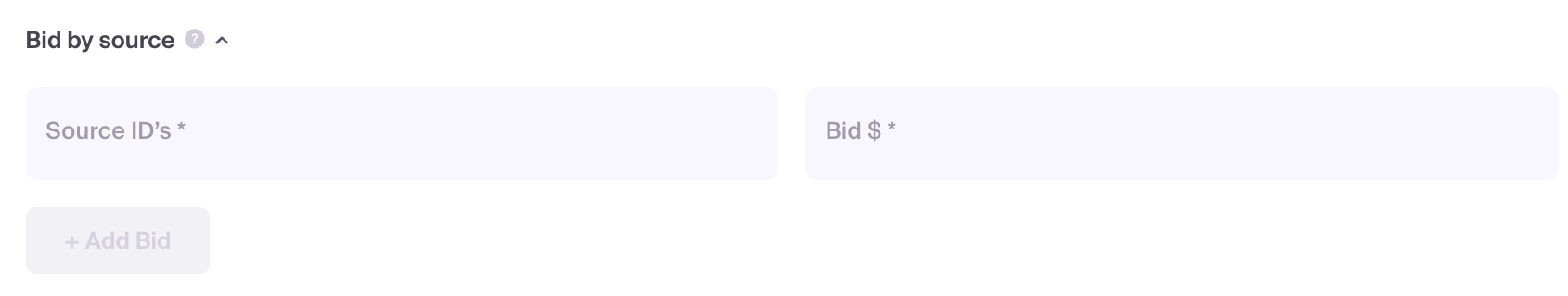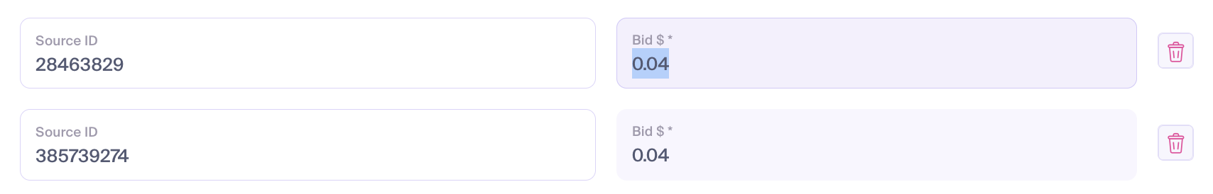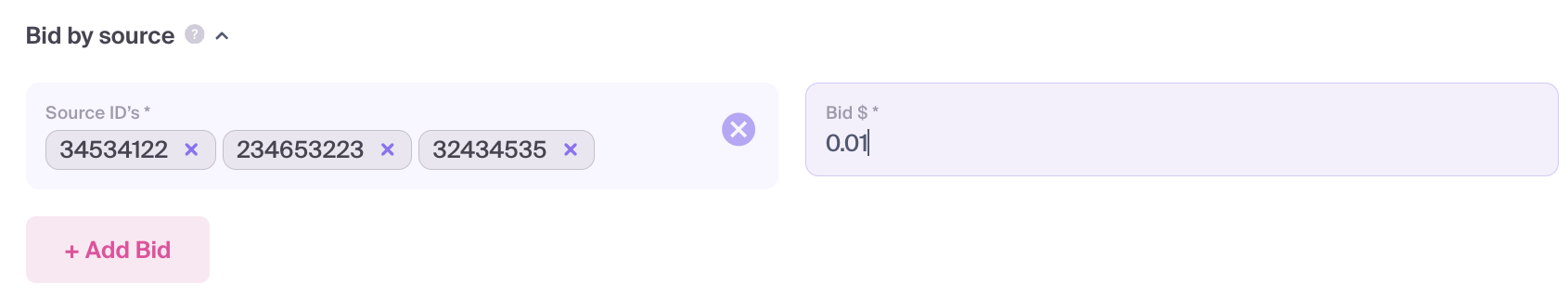 The Bid by Source feature allows you to set custom, granular bids for specific source IDs. This gives you the flexibility to deviate from the global campaign bid to optimize performance for individual traffic sources.