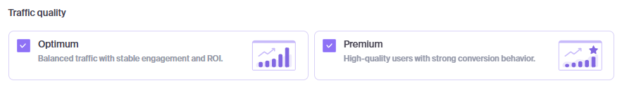 - Optimum Traffic: We highly recommend testing your campaigns with Optimum traffic as well. These segments often provide a more cost-effective way to validate your offers and can deliver excellent results at a lower price point.