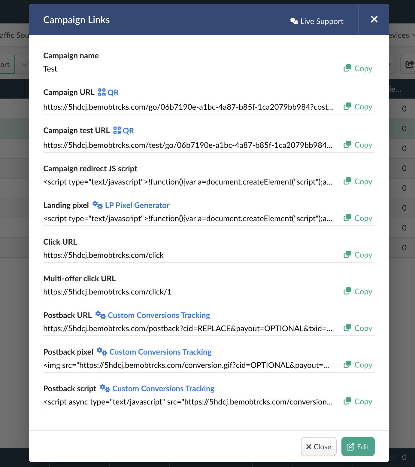 - BeMob will present a window with campaign links. Copy the Campaign URL—this is the link you will use in MyBid.