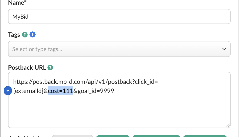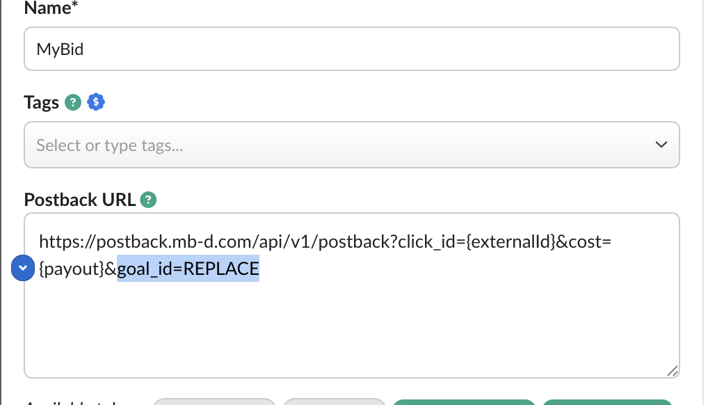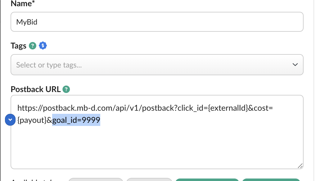 Your finalized postback URL should resemble the following: https://postback.mb-d.com/api/v1/postback?click_id={externalid}&cost={payout}&goal_id=9999(Where 9999 is your specific goal_id)