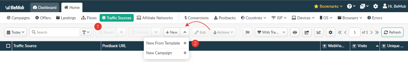 - Navigate to the Traffic Sources tab and click New from Templates.