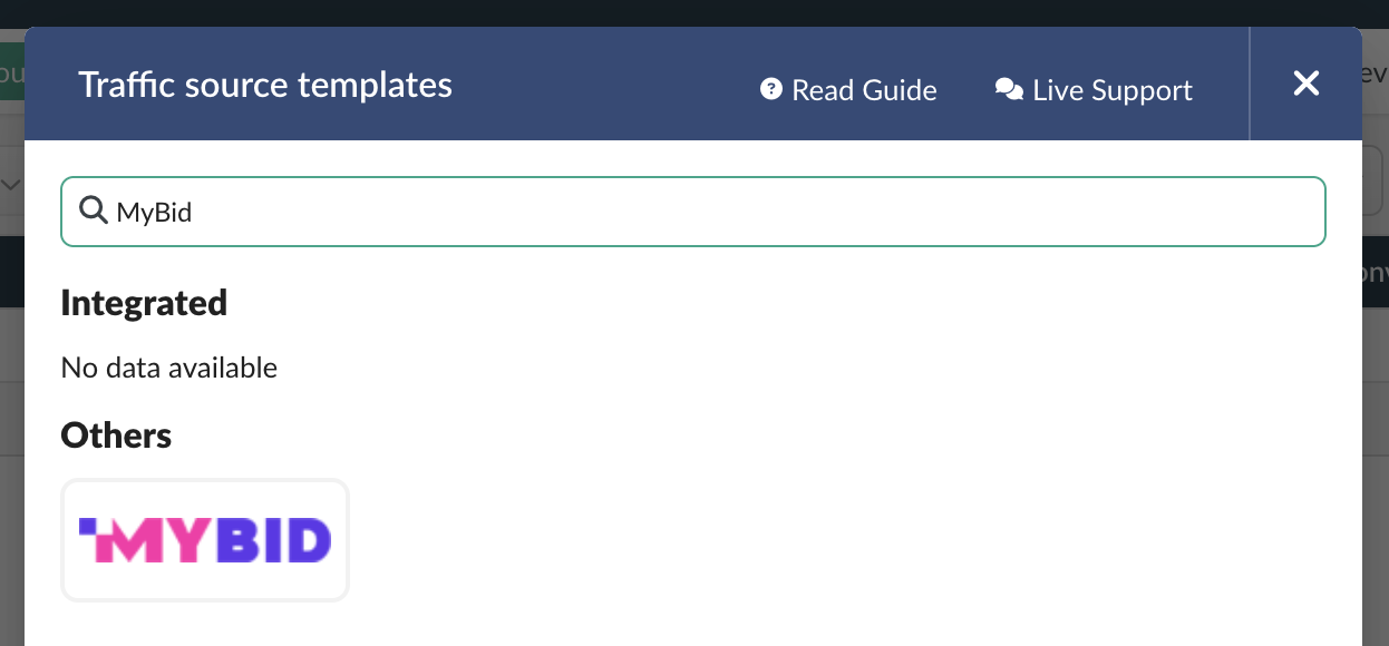 https://postback.mb-d.com/api/v1/postback?click_id={external_id}&goal_id=186&cost={cost}Step 2: Add MyBid as a Traffic Source in BeMob