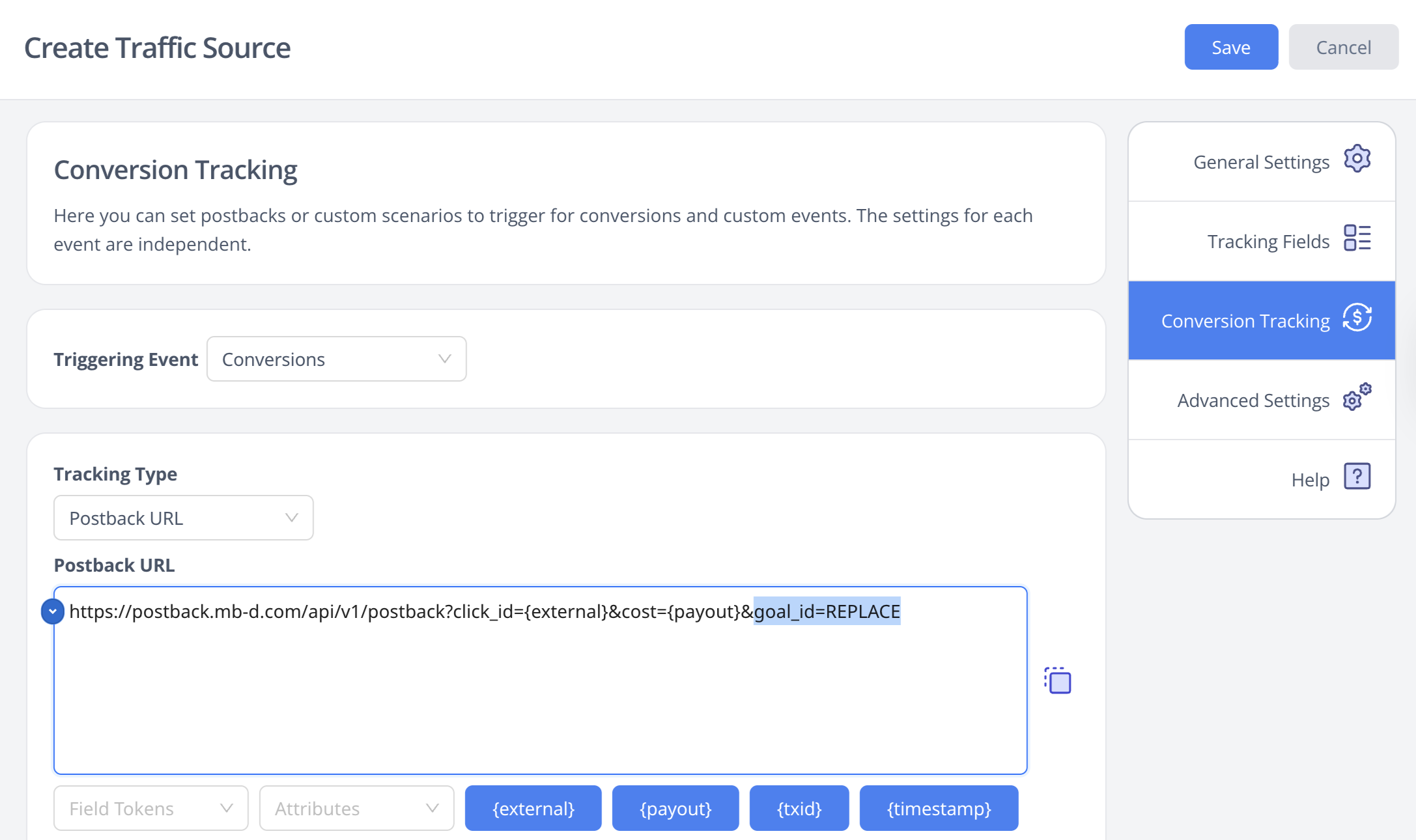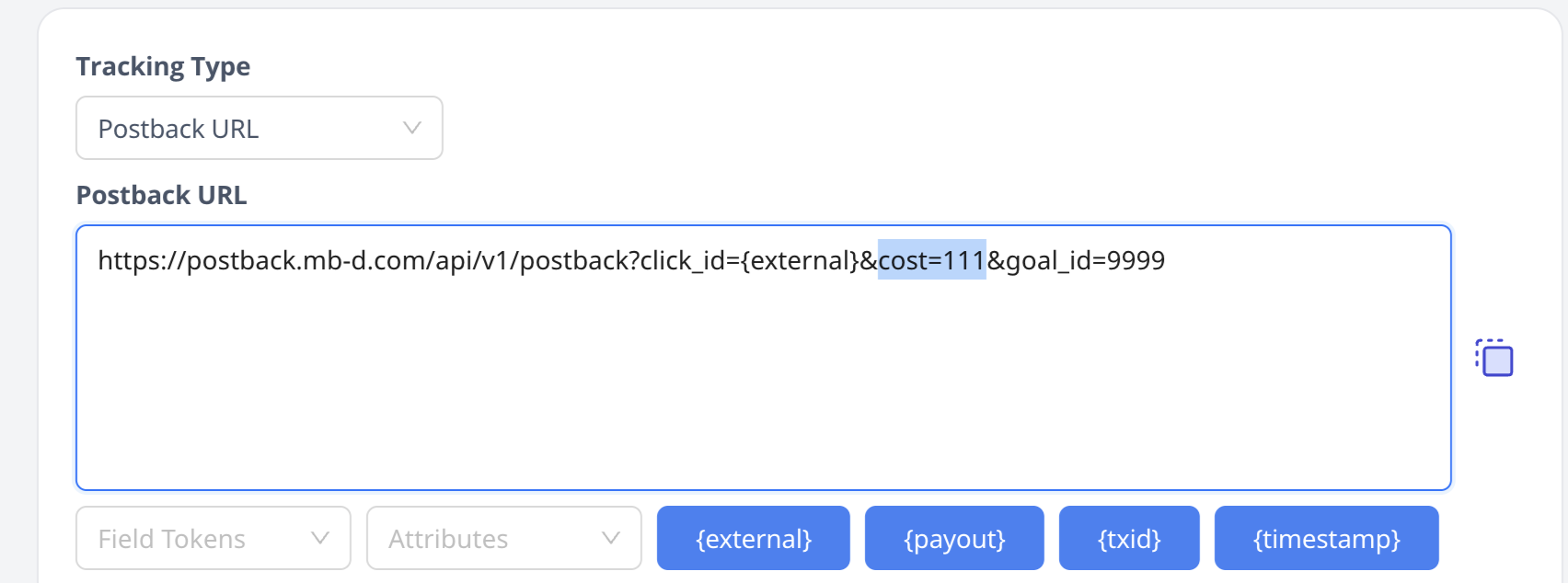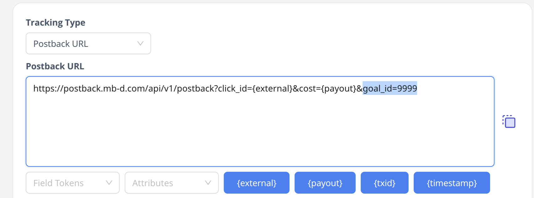 Your finalized postback URL should resemble the following: https://postback.mb-d.com/api/v1/postback?click_id={external}&cost={payout}&goal_id=9999(Where 9999 is your specific goal_id)