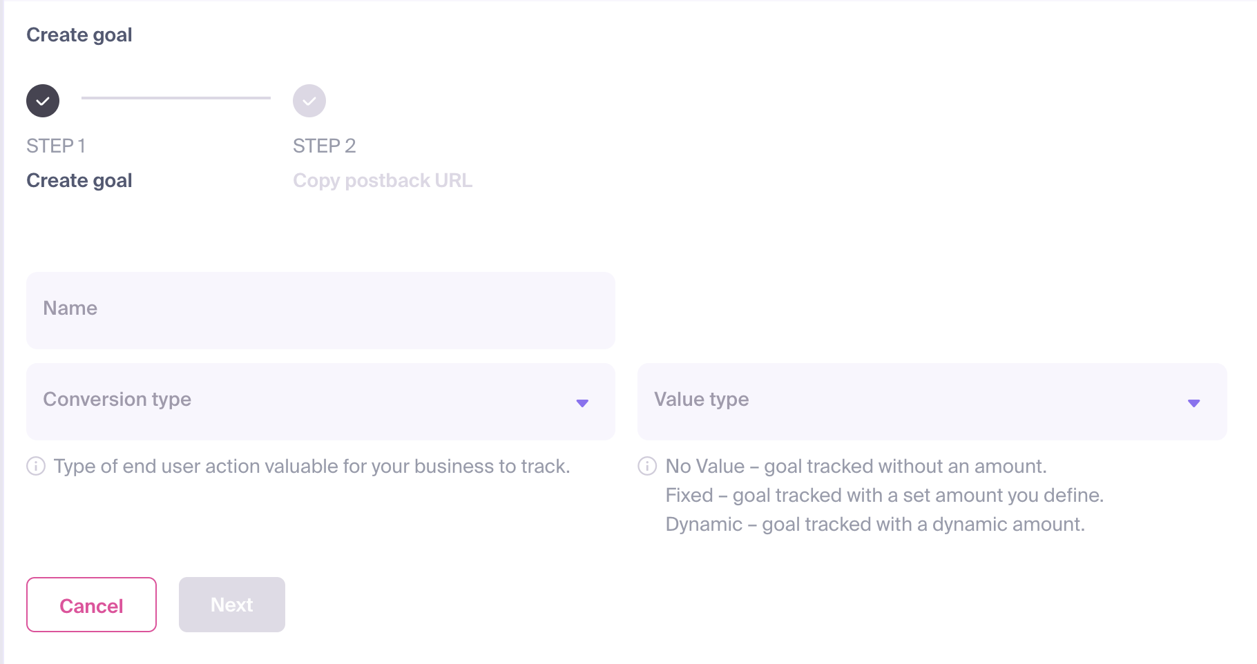 - Dynamic: The conversion value will be passed dynamically through your postback URL.