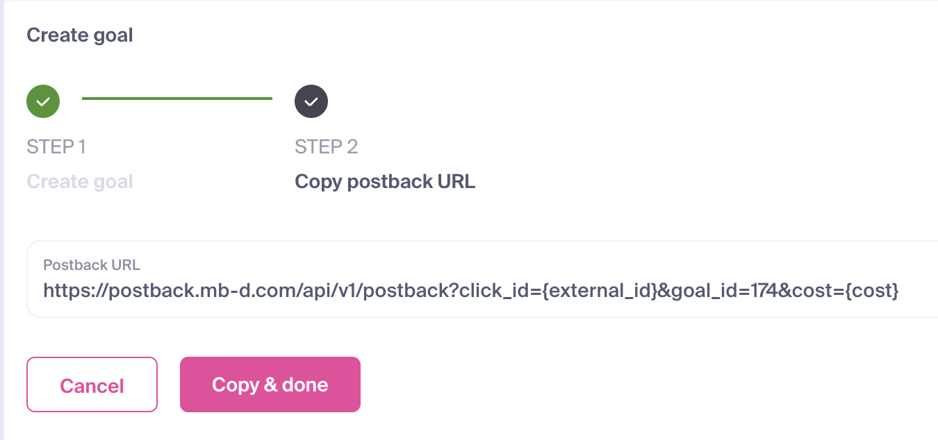 - Click Copy & done to save your new goal and copy the postback URL for integration.