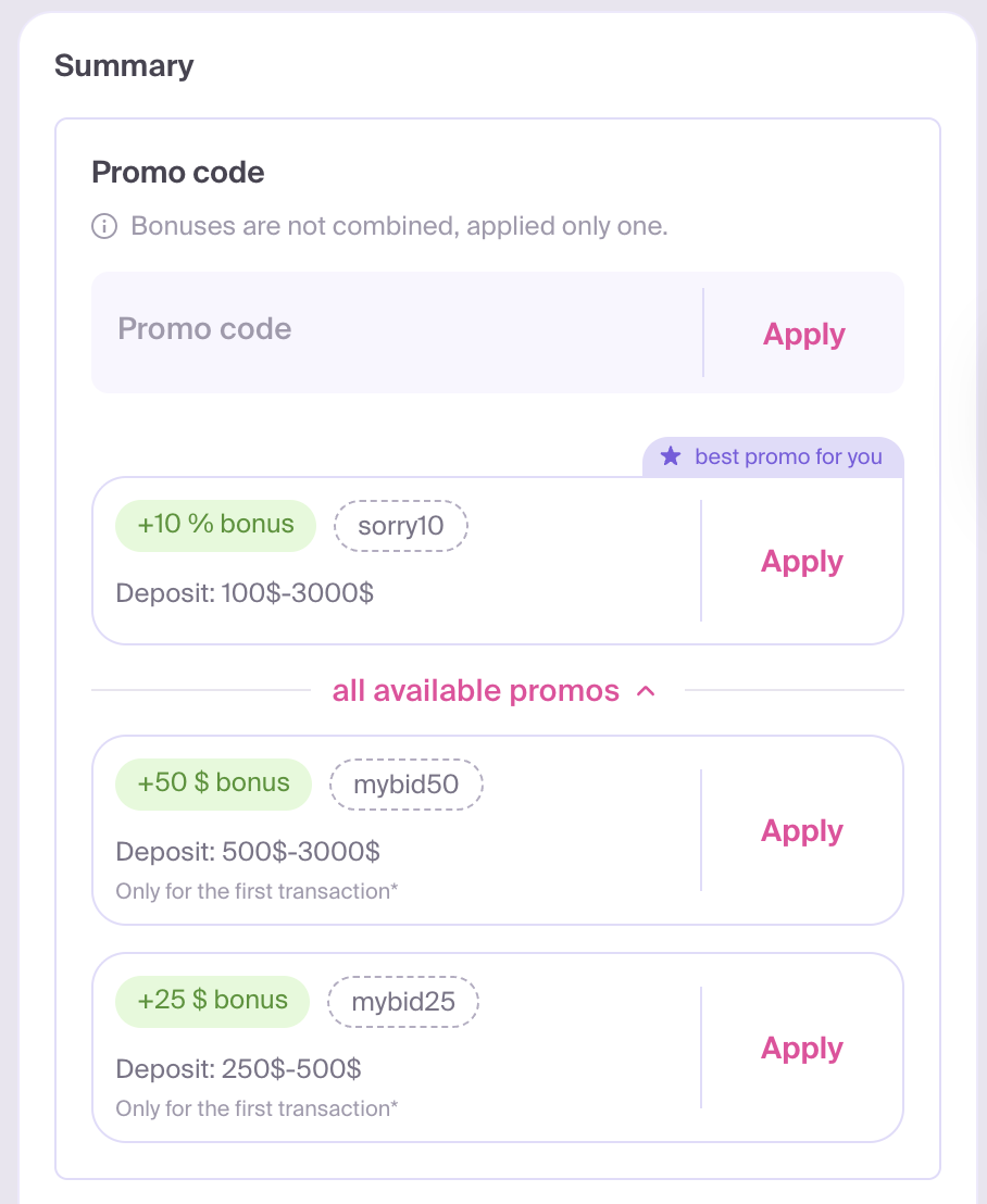Redeeming promo codes is straightforward. MyBid offers various incentives, including first-deposit bonuses and seasonal promotions. Any available promo codes will appear in the Promo code panel on the right side of the deposit screen.