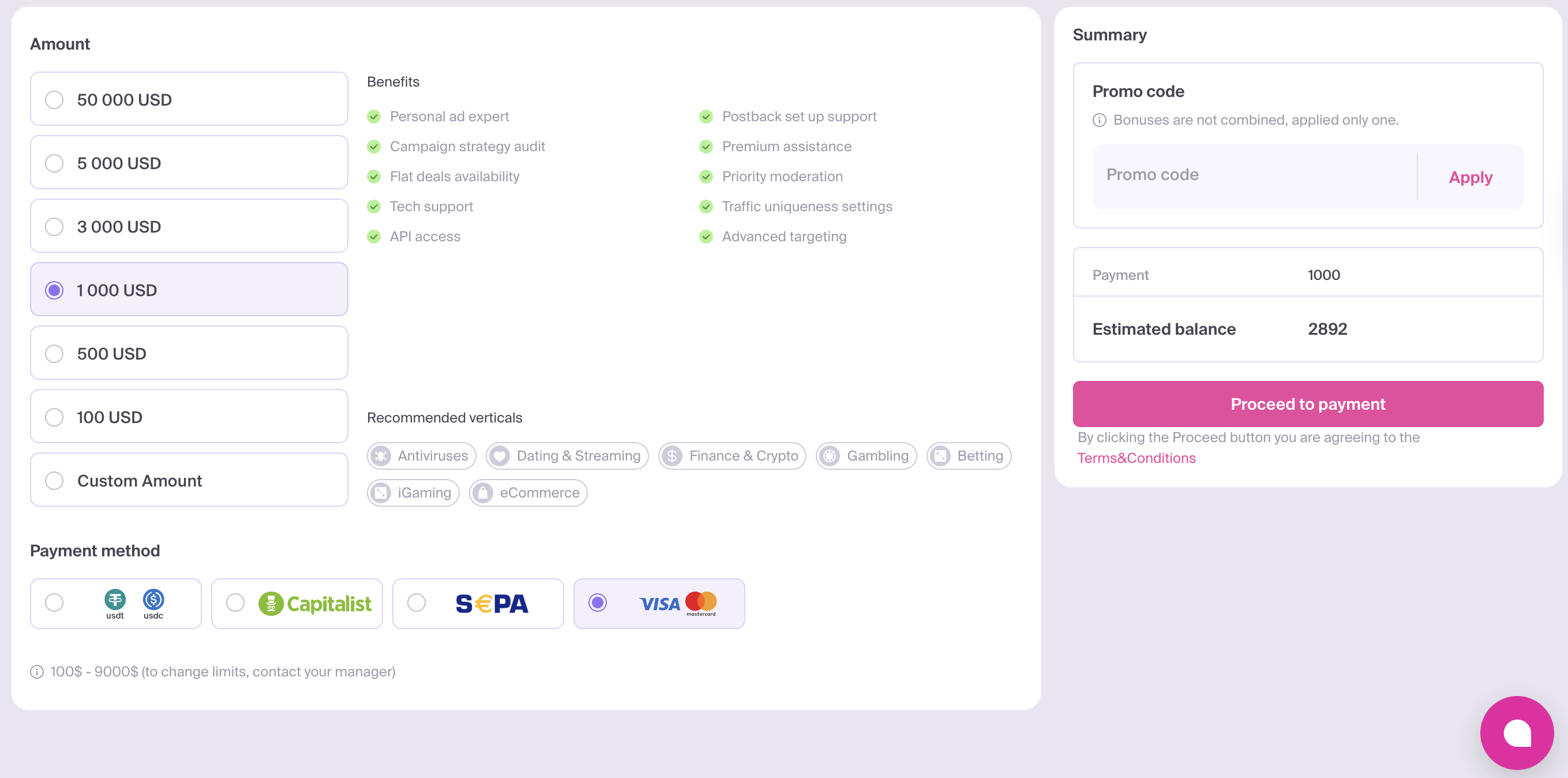 The minimum deposit for Self-Service advertisers is 100 USD across all payment methods.